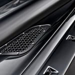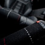 The bespoke touch includes a red Kahn rev counter, red Kahn Churchill time clock, black piano wood centre dash surround, red seat belts, aluminum machined pedals, front and rear racing seats in black quilted nappa leather with Harris Tweed Inserts and silver contrast stitching, centre glove box in black quilted nappa leather and grey alcantara with red and silver contrast stitching, instrument binnacle in grey alcantara with red and silver contrast stitching, dashboard in black nappa leather and grey alcantara with red and silver contrast stitching, roof lining in grey alcantara with Harris Tweed inserts and red contrast stitching, sun visors in grey alcantara with Harris Tweed inserts and red contrast stitching and door trims in black quilted nappa leather and grey alcantara with silver contrast stitching.